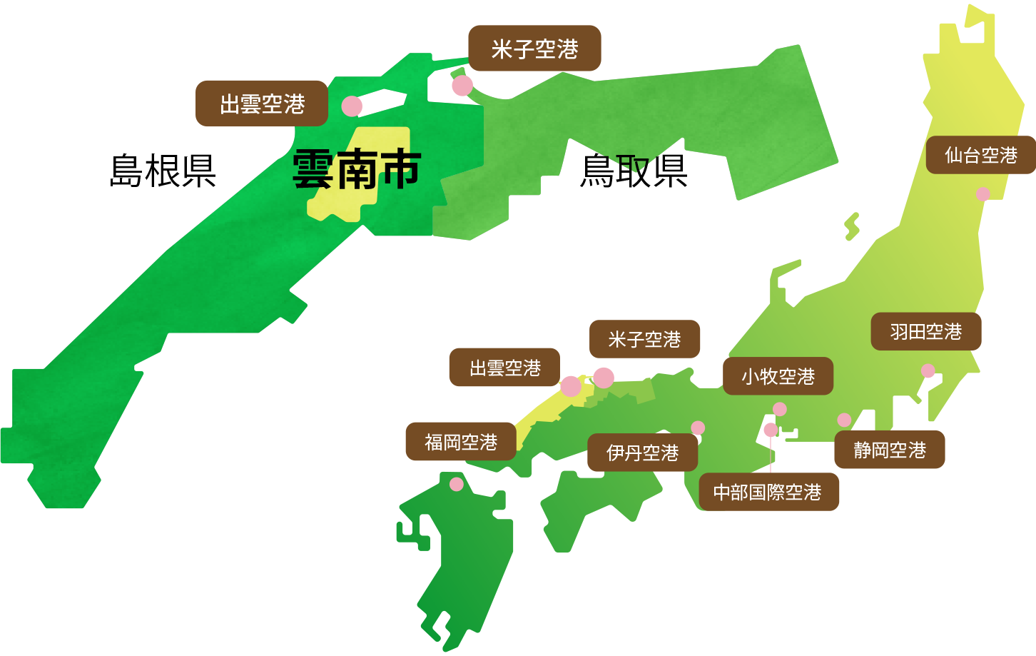 About Unnan City雲南市は、島根県の東部に位置する人口約3万5千人(2023年7月時点)の自然豊かな街です。市の南部は山間地域で中国山地にかかり、北部は出雲平野に 続いていることから、市の南北で標高差が大きい地域です。斐伊川とその支流の久野川などが流れており、斐伊川堤防沿いには「日本さくら名所100選」にも選ばれた見事な桜並木が約2kmにわたって続いています。また、日本古来の製鉄法「たたら製鉄」の中心地、さらに神話の舞台にもなった地域でもあり、見どころが多くあります。