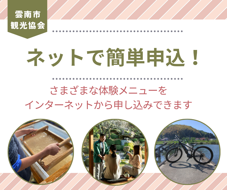 【お知らせ】インターネットから体験メニューの申し込みが可能です 雲南市観光協会でお受けしている各種体験メニューについて、インターネットからお申し込みを受け付けています。 コチラのページからご確認ください。