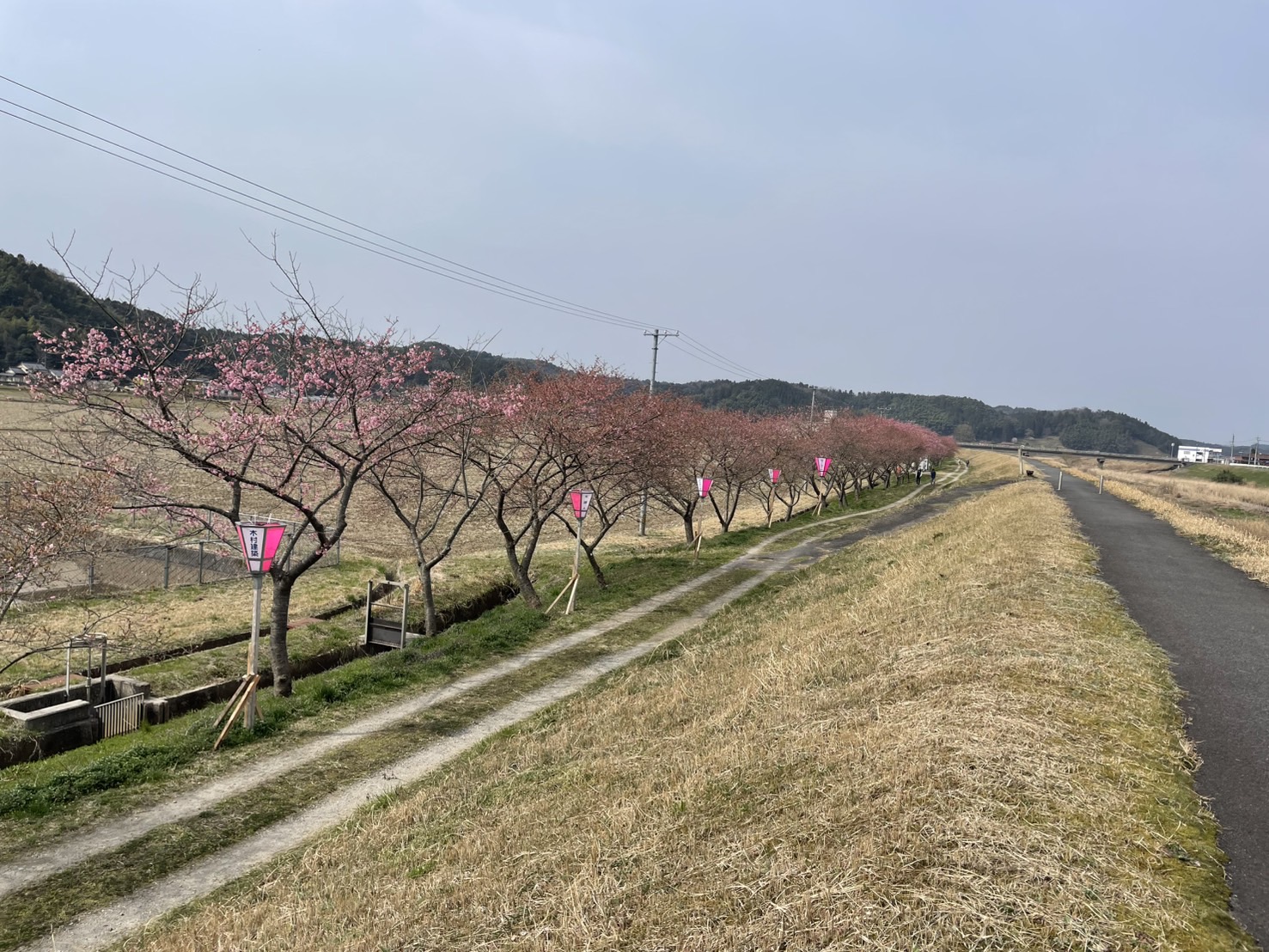大東町の赤川沿いの河津桜の今日3月24日のようすです。