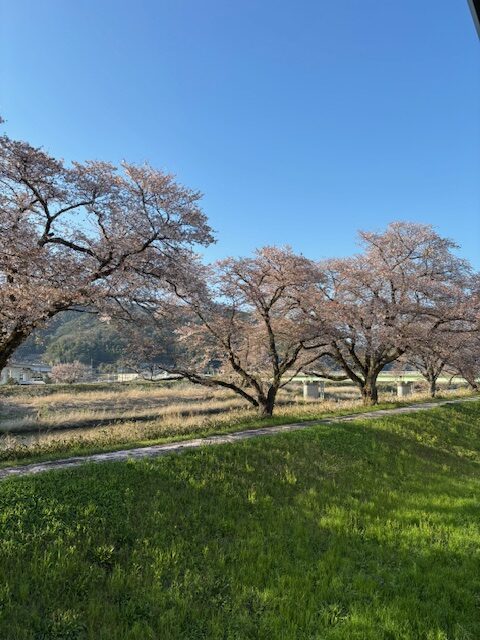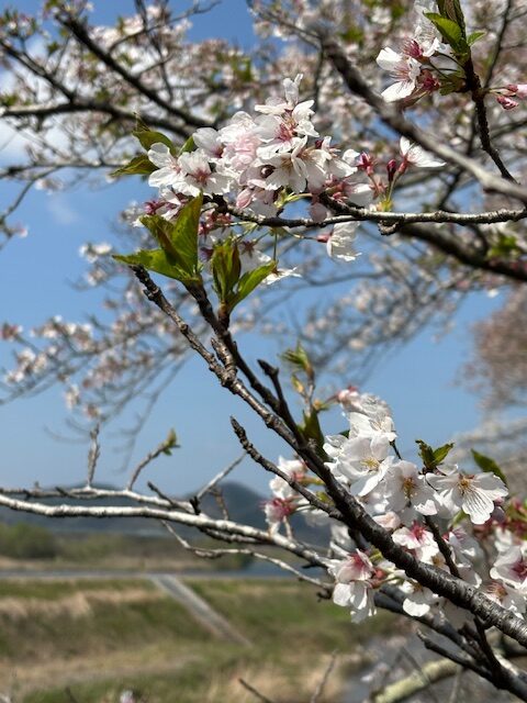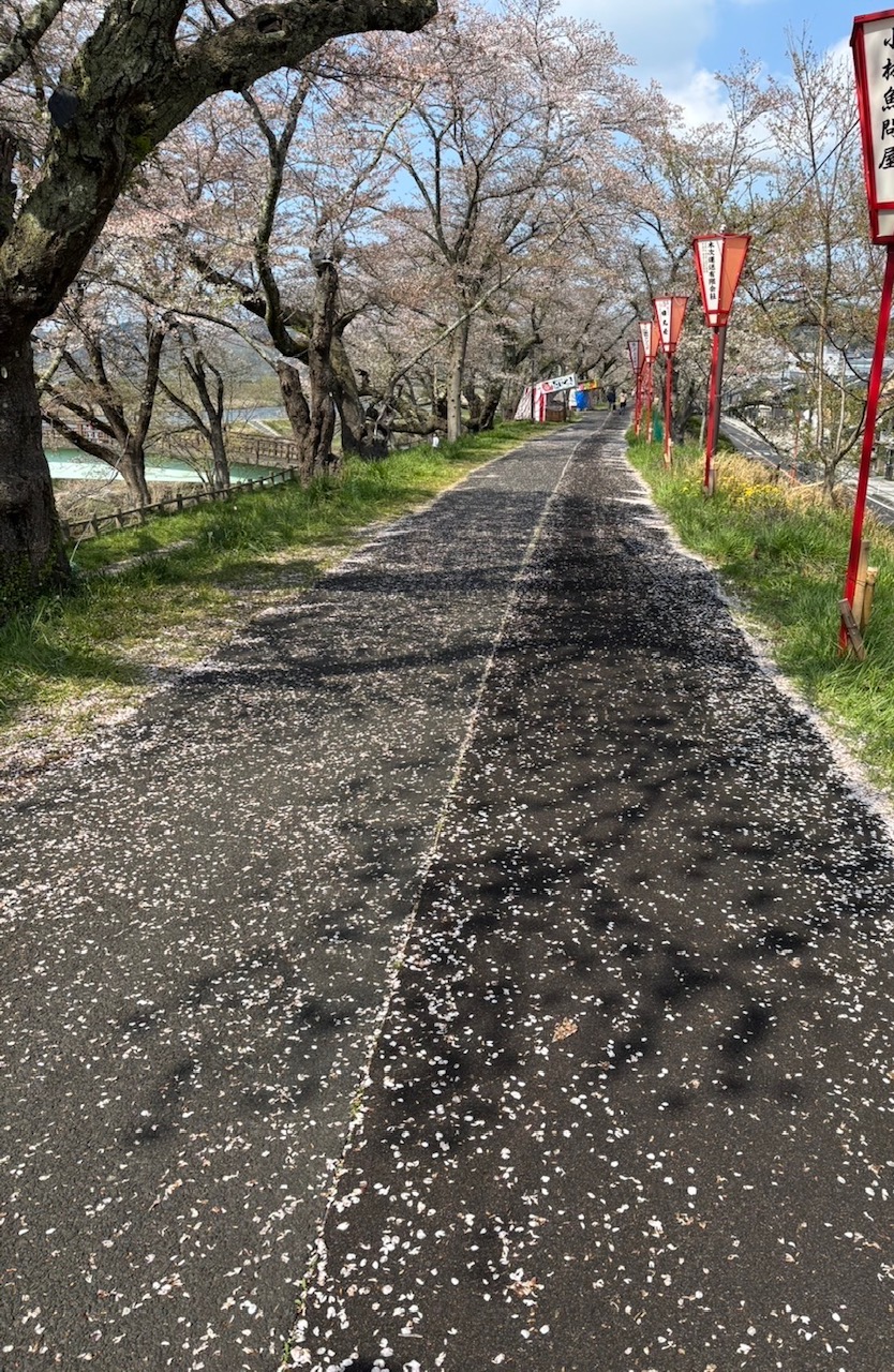 今日の木次町斐伊川堤防桜並木の様子です。ソメイヨシノの花はほとんど落ちましたが、桜色のじゅうたんが綺麗です。