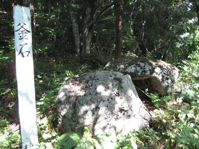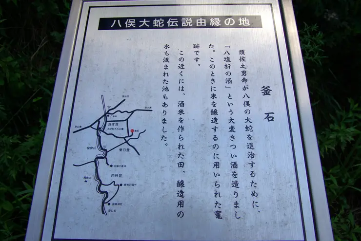 この岩は、スサノオノミコトがヤマタノオロチに飲ませたお酒「八塩折りの酒(やしおおりのさけ)」を作らせた釜跡という言い伝えがあります。