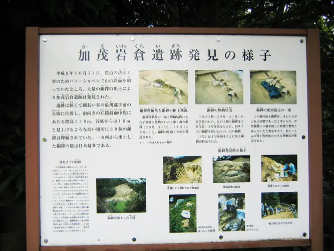平成8年10月14日、加茂町岩倉の農道工事現場より弥生時代中期から後期と思われる大量の銅鐸が出土し、一カ所の出土としてはこれまで全国最多の39個が確認されました。銅鐸とは弥生時代の青銅器のひとつで、使用目的は未だに謎に包まれています。出土した銅鐸は弥生時代中期ごろに作成された古い形式のものと、新しい形式のものとがあります。