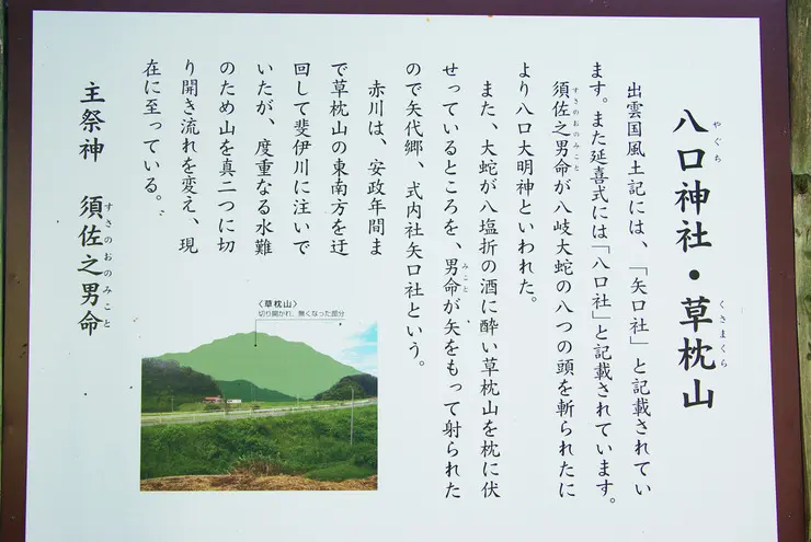 八塩折の酒(やしおおりのさけ)を飲んだヤマタノオロチが苦しんで枕にして寝た山だといわれているのが草枕山です。