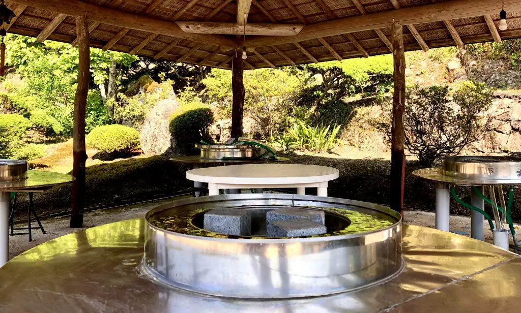 お手入れされた庭園と山を眺めながら、くるくる回る流しそうめんを楽しむことができます。
