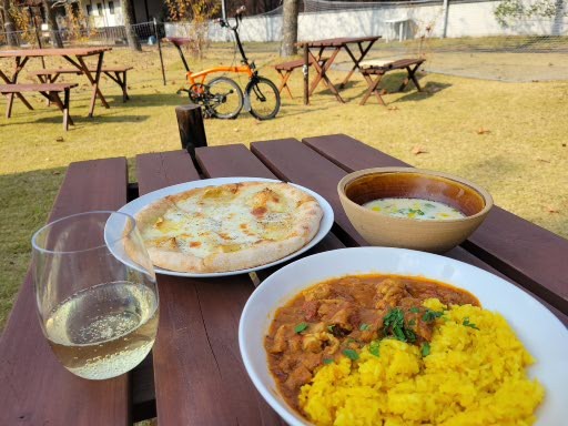 その庭カフェでは、木次乳業のチーズを使用したピザやドリンクなどを楽しむことができます。