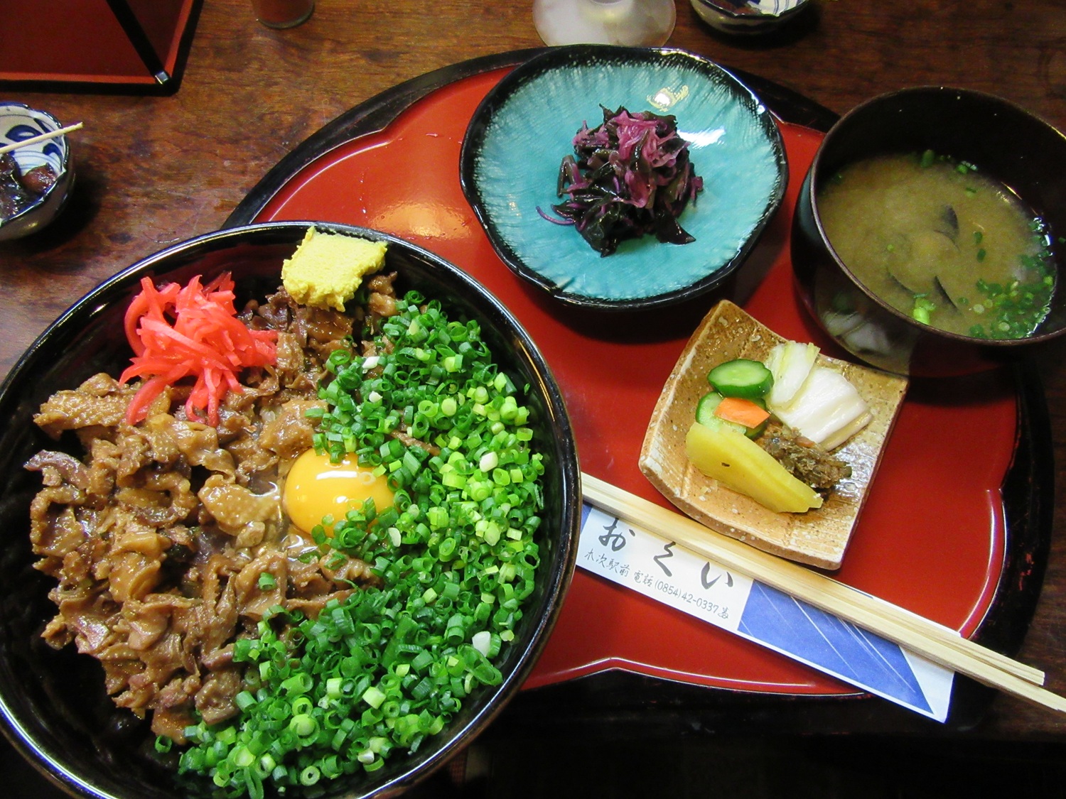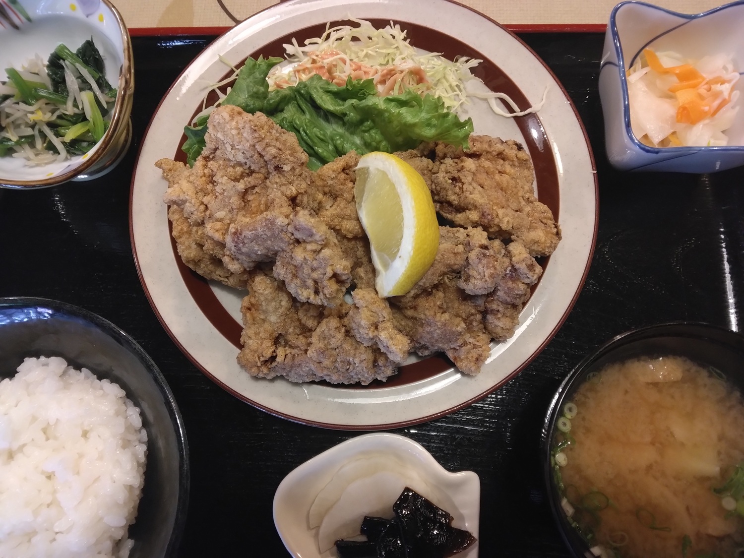 JR木次駅前近くにある「お食事処おくい」では、人気の唐揚げ定食やモツ丼のほか、麺類や一品料理があります。