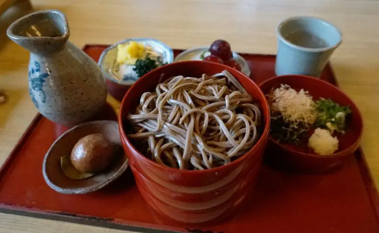 そばの他に、店主の⼿作りそば饅頭、⾹の物がつく嬉しいサービスもあります。
