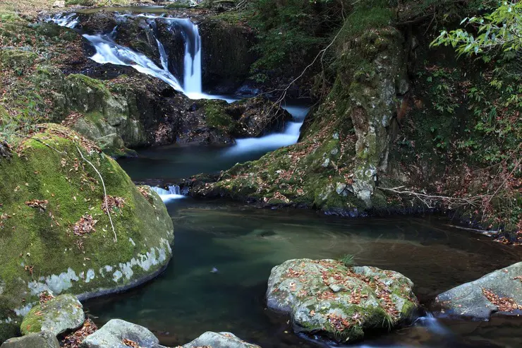 うっそうと老樹が繁茂する約1.5kmの清流に変化にとんだ8つの滝(下流より猿飛滝、滝尻滝、紅葉滝、河鹿滝、姥滝、姫滝、八塩滝、八汐滝)があり、渓谷美をなしています。